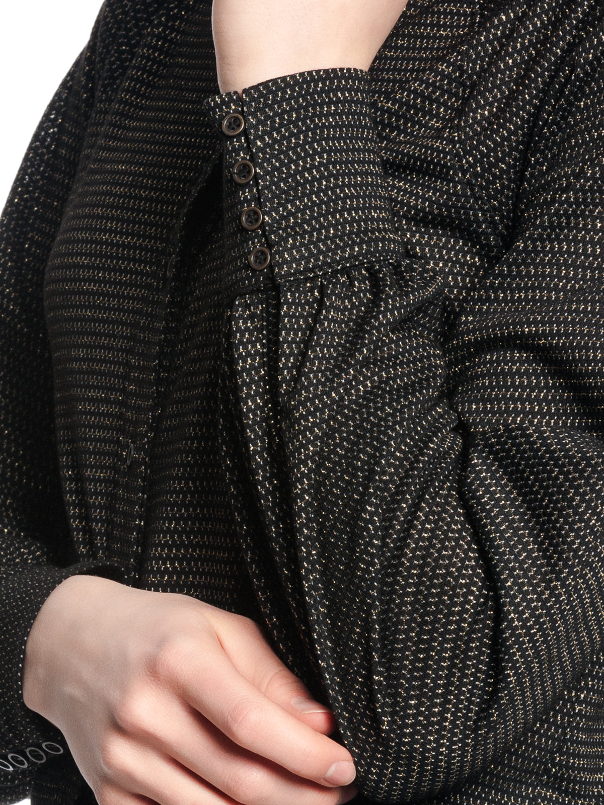 Die coole Vive Maria Bluse ist aus einem leichten Polyester-Viskosematerial mit Metallicgarnanteil. Sie hat lange Arme, die mit Manschetten abgeschlossen werden. Die Bluse hat eine gerade Passform und eine durchgehende Knopfleiste. Der schwarze Stoff ist mit einem goldenen Faden durchwebt, der einen schönen Glanzeffekt hinterlässt. Die 'Berlin Boheme' Bluse ist perfekt geeignet fürs Büro. Kombiniert mit einer schwarzen Stoffhose oder einem Pencil Skirt unterstreicht sie den Businesslook. Je nach persönlichem Geschmack kann man die Bluse hochgeschlossen tragen oder die ersten Knöpfe offen lassen.
