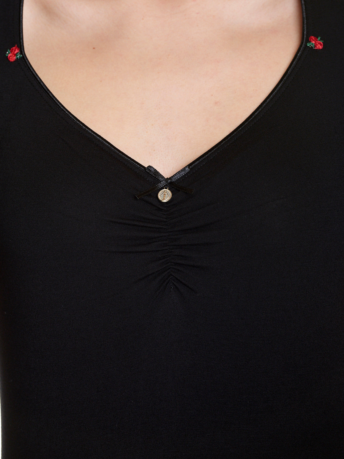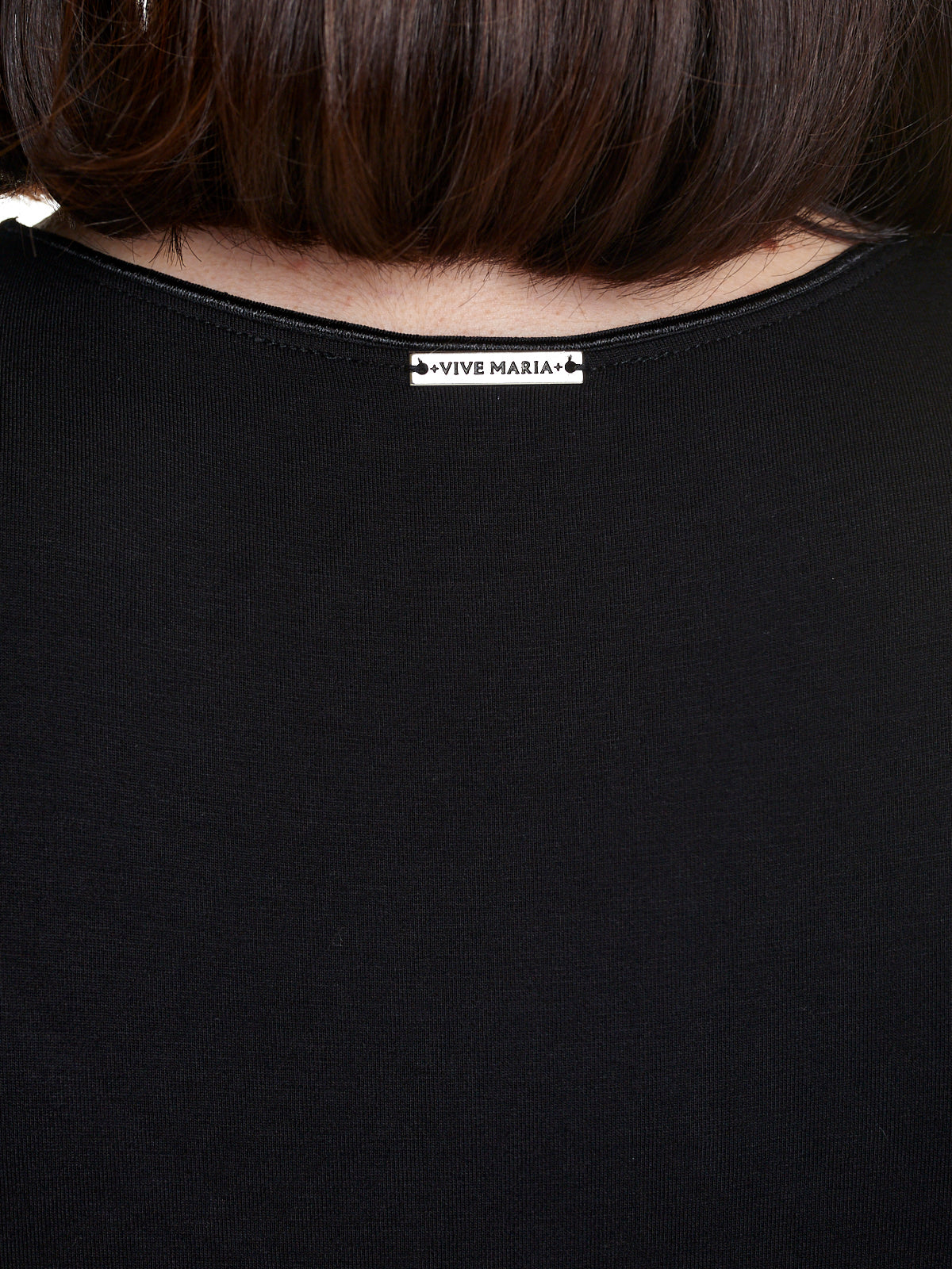 Das total süße Vive Maria Shirt ist aus einem angenehmen Viskosematerial mit Elasthananteil. Es ist figurbetont geschnitten, hat kurze Arme und einen V-Ausschnitt, der seitlich mit gestickten Röschen verziert ist. Eine Satinschleife, der typische Vive Maria Metallanhänger und eine kleine Raffung sorgen für ein schönes Dekolletee.